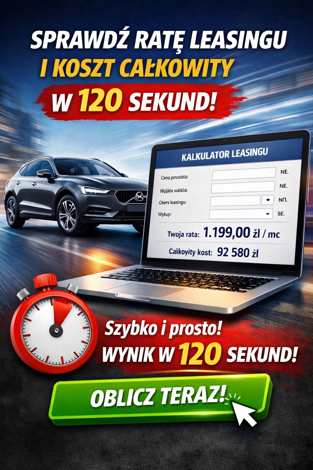 Planujesz zakup samochodu lub maszyny? Sprawdź, czy możesz płacić niższą ratę leasingu. W 2 minuty samodzielnie sprawdzisz ratę i koszt leasingu  — bez podawania danych, bez haczyków⬇️.